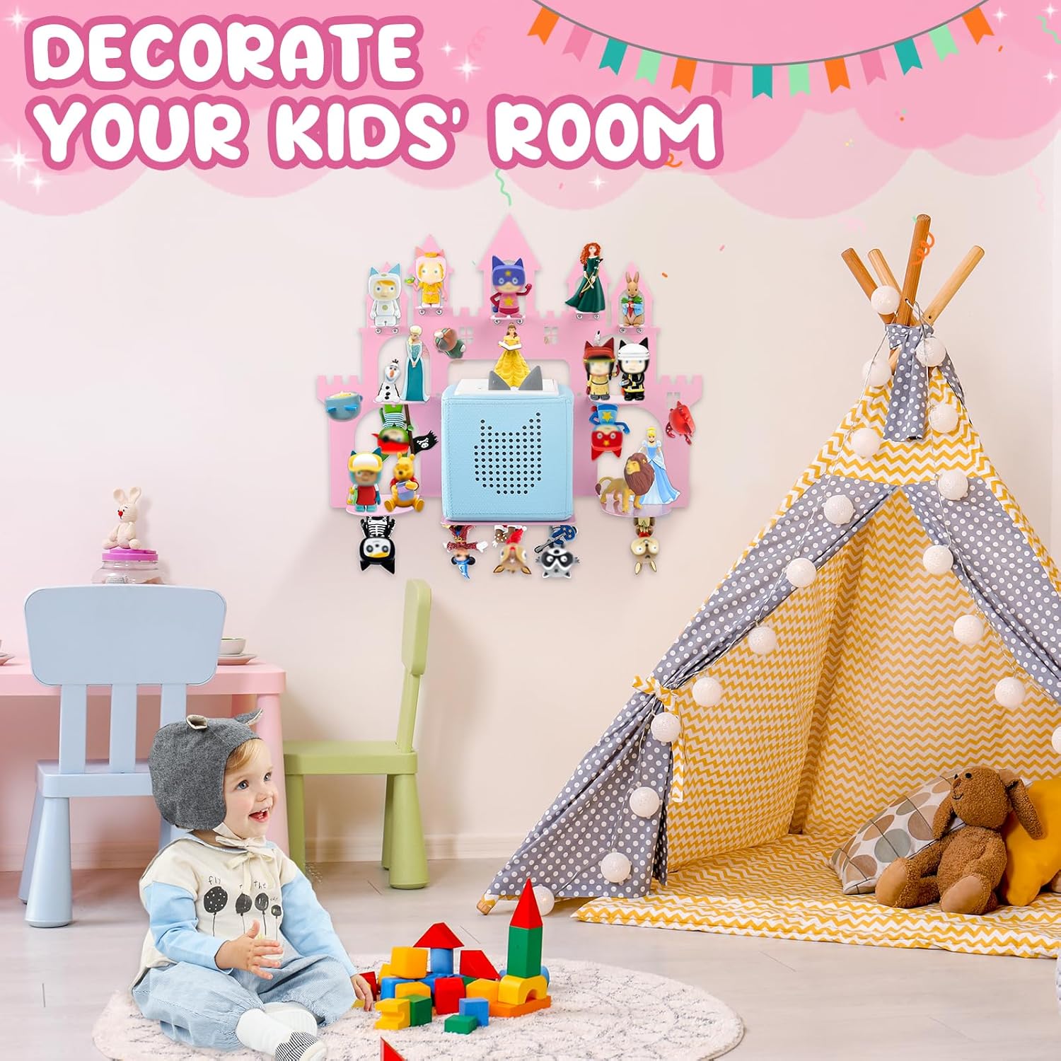 Perfekt für Geburtstage, Feiertage oder einfach, um einem Kinderzimmer Charme zu verleihen – dieses Regal verwandelt die Aufbewahrung in ein schlosswürdiges Display.