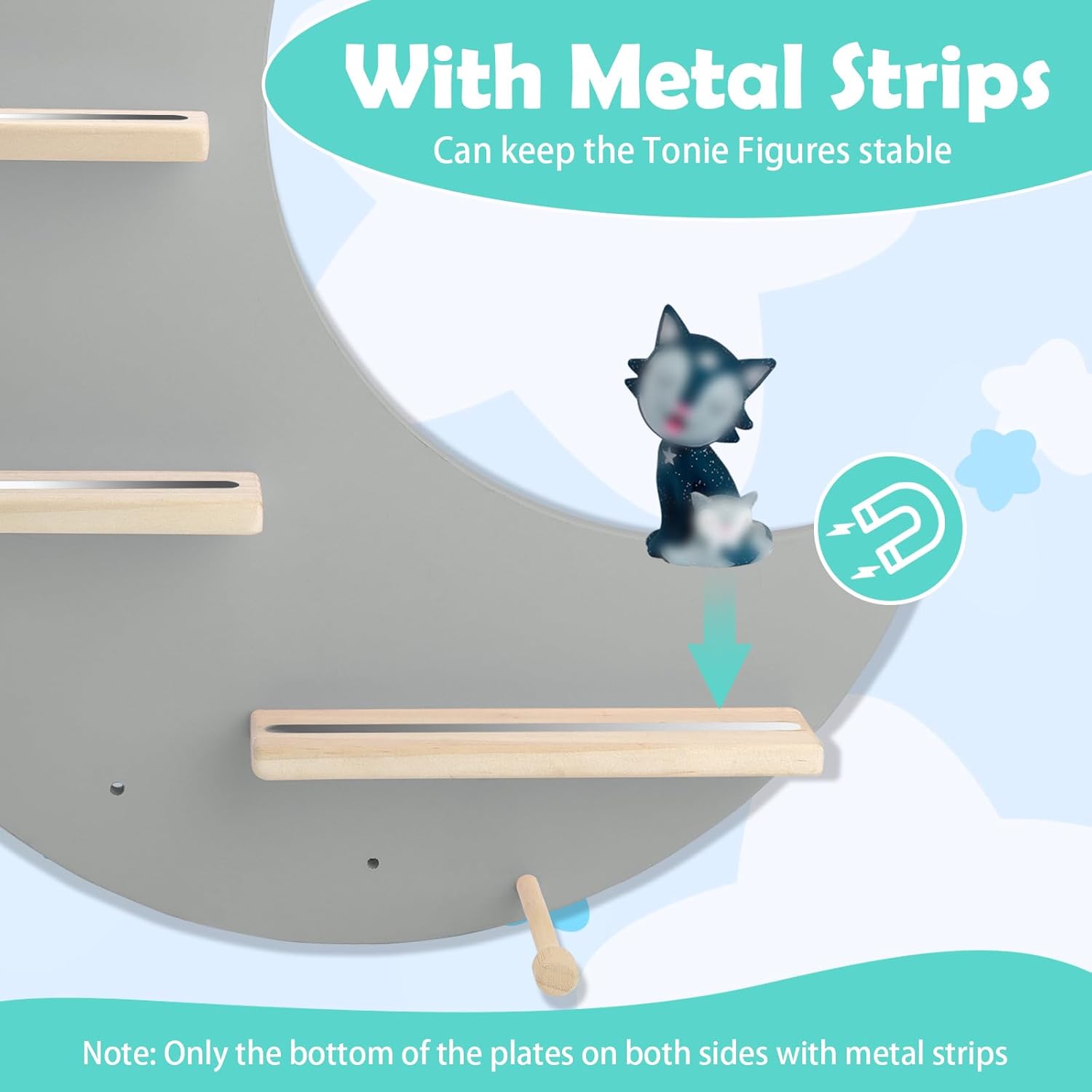 Tonies-Figuren haften fest an den magnetischen Oberflächen und können beidseitig präsentiert werden – sogar kopfüber. Das mittelgroße Regal verfügt über einen Magnetstreifen oben für eine sichere Platzierung. Hält 8–22 Figuren im gesamten Set.