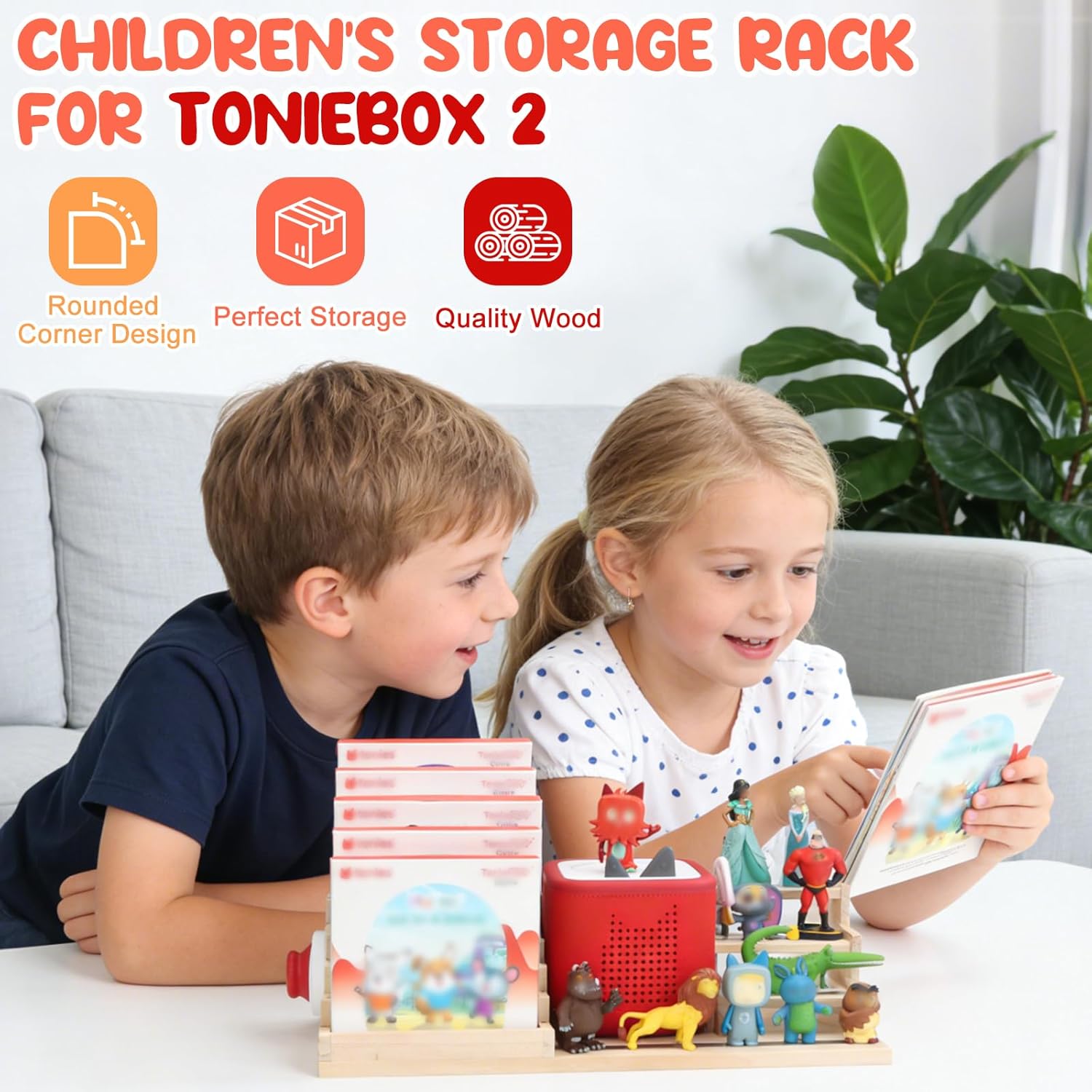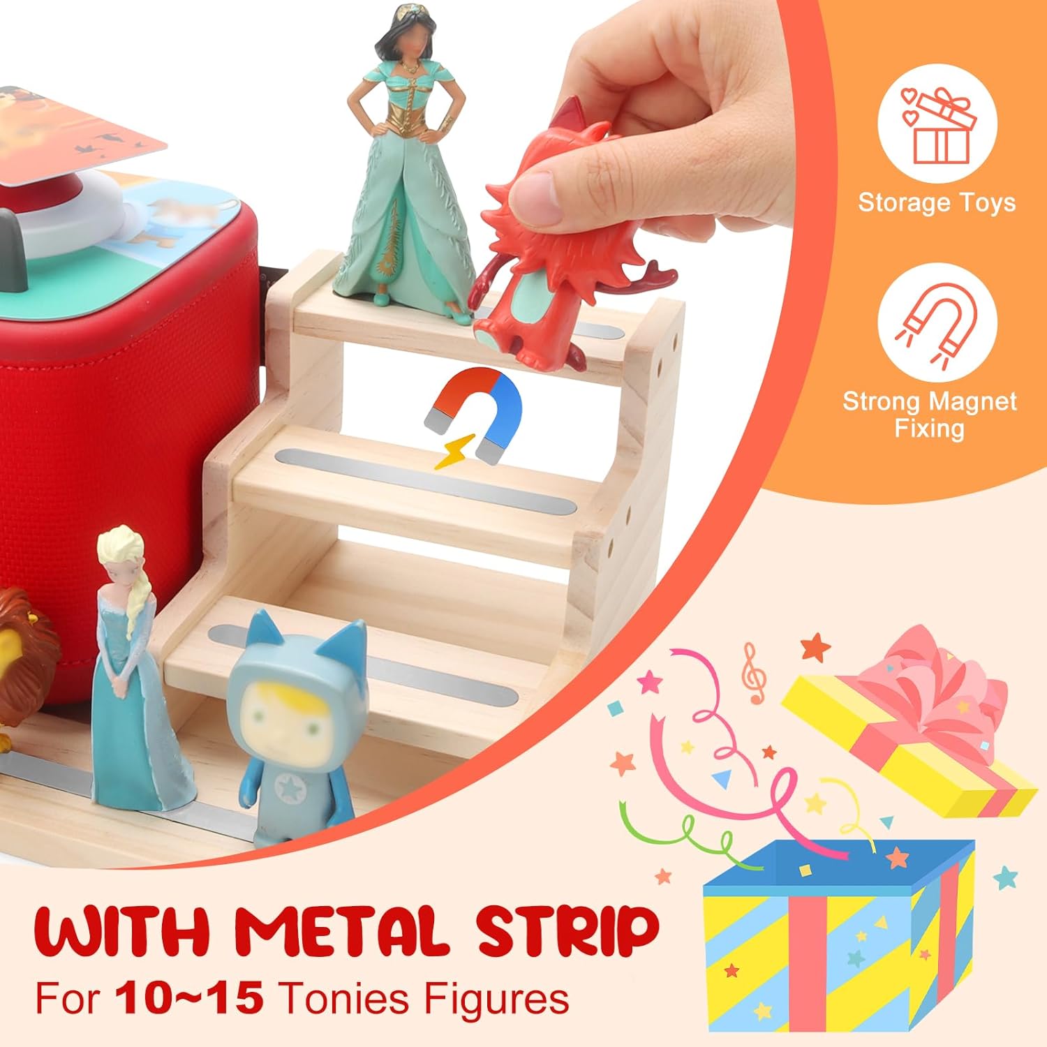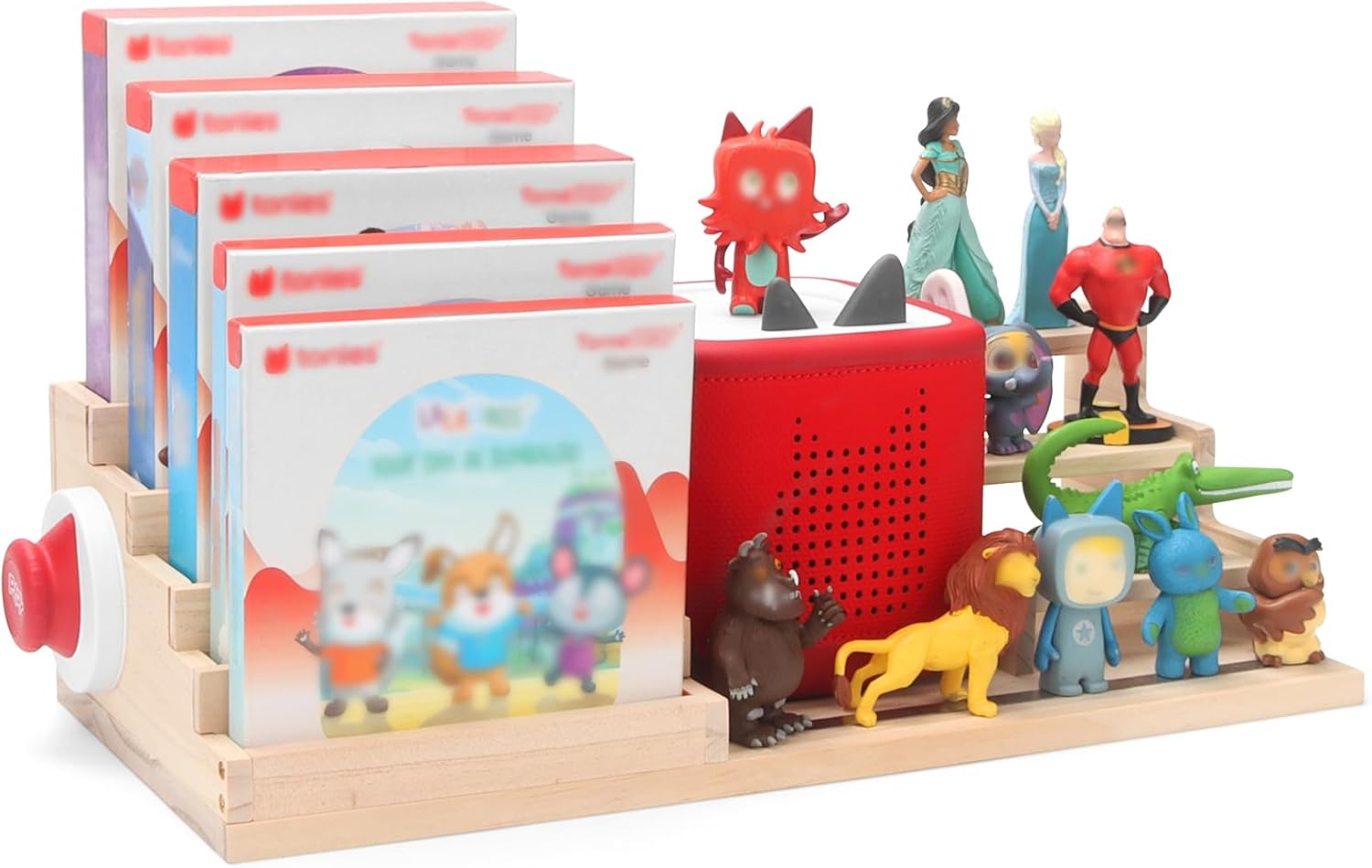 Dieses magnetische Aufbewahrungsregal ist eine großartige Ergänzung für jedes Kinderzimmer. Es organisiert den Audioplayer (erste und zweite Generation), die Geschichten-Figuren und die Ladestation ordentlich zusammen – so gehen keine Teile mehr verloren oder werden verlegt. (Das Ladegerät kann von der Rückseite des Regals angeschlossen werden, um den Player aufzuladen.)