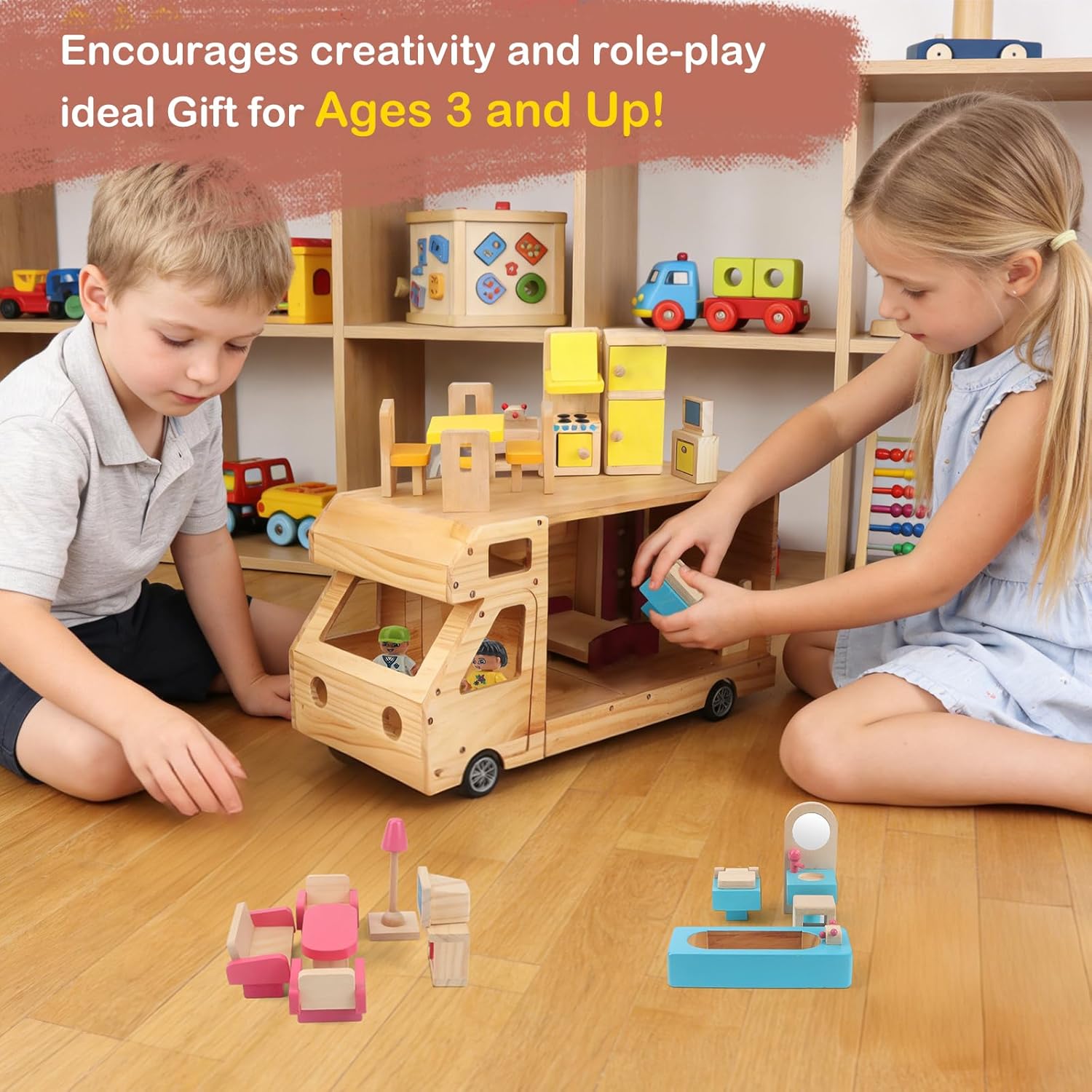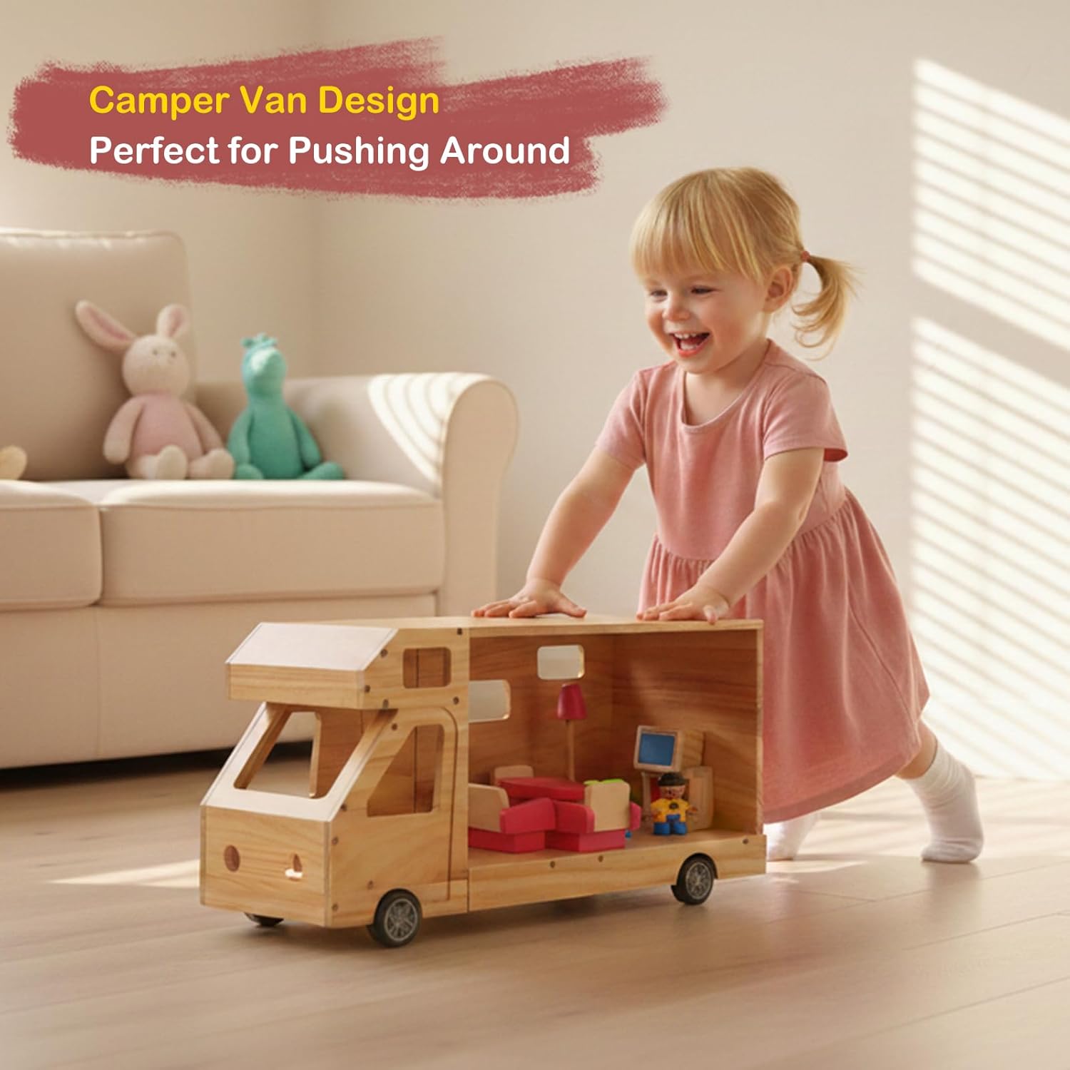 Mit diesem einzigartigen Wohnmobil-Puppenhaus können Kinder wie mit einem echten Wohnmobil schieben, rollen und „reisen“. Sie können ihr Puppenhaus an einen neuen Ort fahren, es öffnen und jedes Mal eine völlig neue Geschichte beginnen.