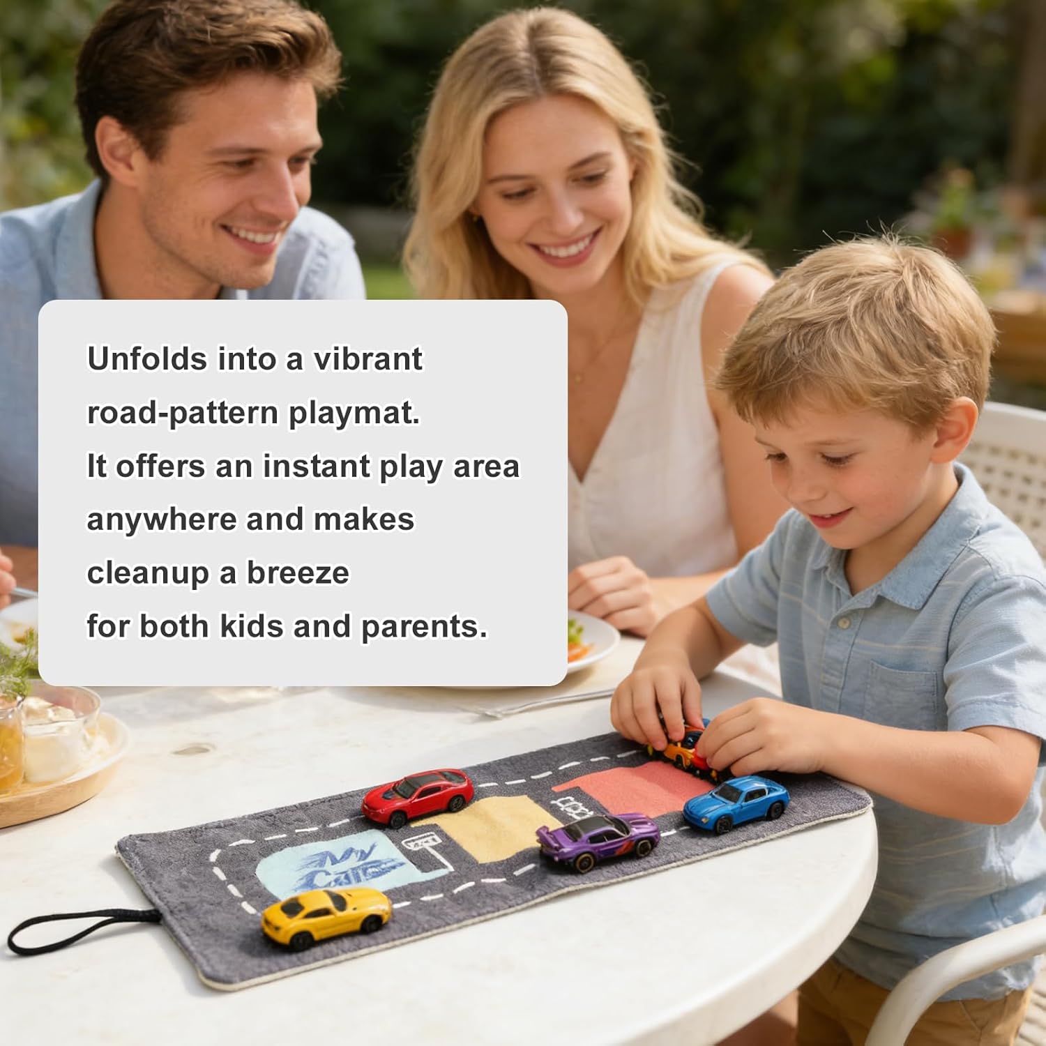 No more losing your child's favorite toy cars! This versatile storage roll features 6 individual slots and unfolds into a vibrant road-pattern playmat. Offers an instant play area anywhere and makes cleanup a breeze for both kids and parents. (Note: Cars not included.)